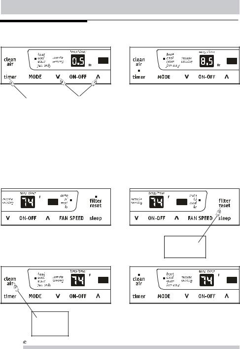 ) para cambiar el temporizador en incrementos de 0.5 horas hasta 10 horas, y en incrementos de 1 hora hasta 24 horas. El controlador hará una cuenta atrás del tiempo restante hasta el inicio (8, 7.5, 7, etc...). La operación de encendido programado seleccionará automáticamente frío con la máxima velocidad de ventilador (si el último modo seleccionado era "Cool" (frío), "Energy Saver" (ahorro de energía) o "Fan Only" (sólo ventilador)). La temperatura se mantendrá igual que la que estuviera establecida previamente. Para cambiar la temperatura establecida, oprima "COOL" (frío) y después los botones de flecha arriba o abajo hasta que la pantalla indique la temperatura deseada. Tras 5 segundos, el control cambiará automáticamente la pantalla de vuelta a la cuenta atrás horaria hasta el encendido/apagado. Si oprime el botón On/Off en cualquier momento se cancelará la función de encendido o apagado programado. Una vez que haga eso, deberá repetir de nuevo todos los pasos descritos arriba.